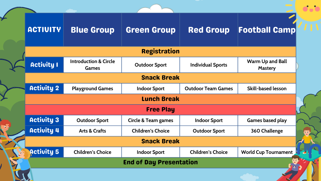 Full Day: 09:00 to 17:00 Half Day: 09:00 to 13:00 or 13:00 to 17:00 * Children age 4 are ONLY permitted to attend HALF Days * Note: Our camp doors open from 08:30 for any parent wishing to drop-off early, at no extra charge |